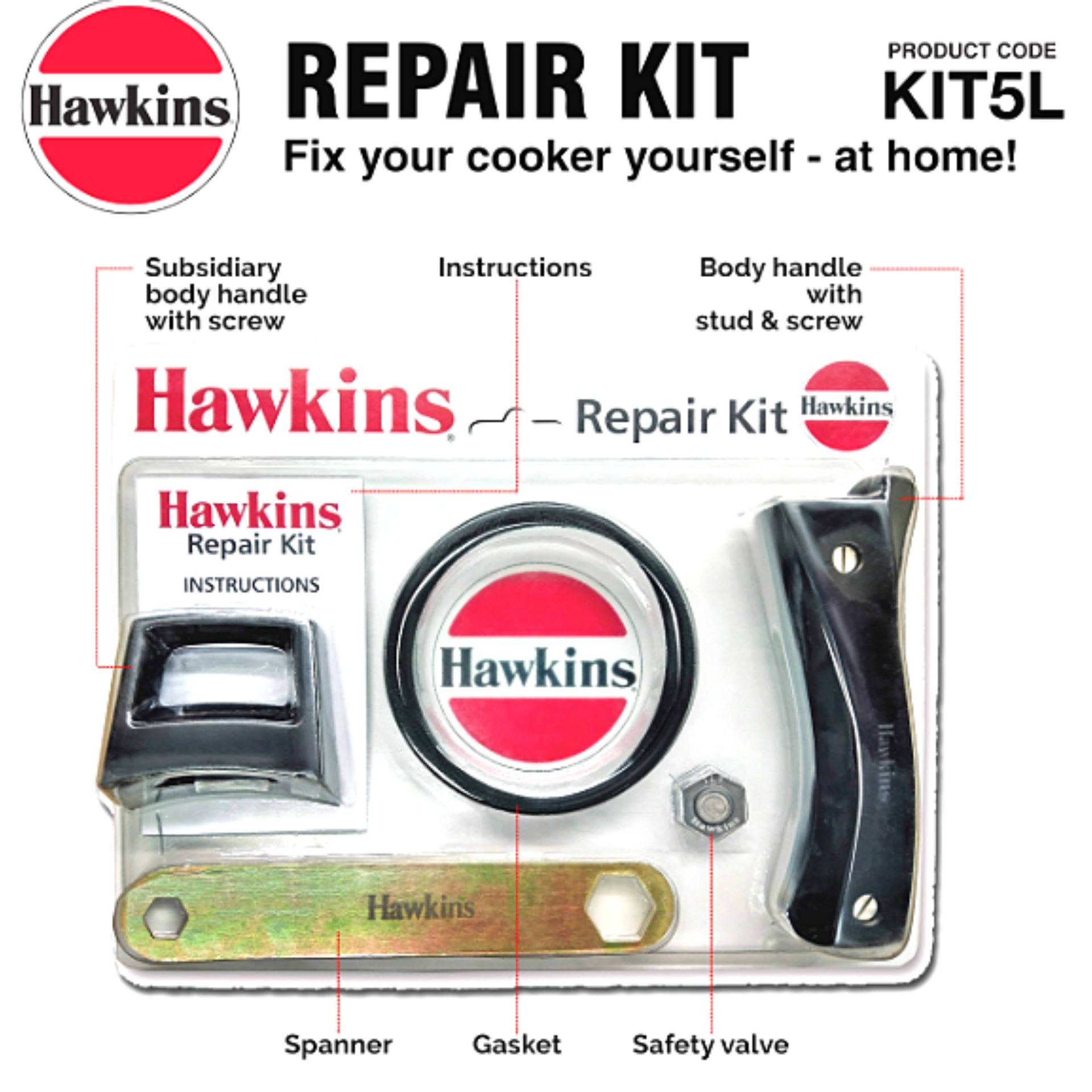 प्रेशर कुकर मरम्मत किट (गैस्केट, सुरक्षा वाल्व, बॉडी हैंडल, स्पैनर) हॉकिन्स